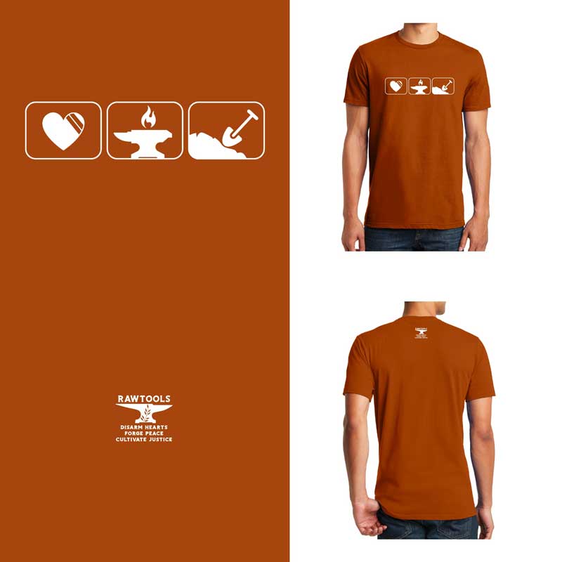 The picture version of our mission statement, Disarm Hearts, Forge Peace, Cultivate Justice. Orange shirt with white art and the RAWtools logo on the back.